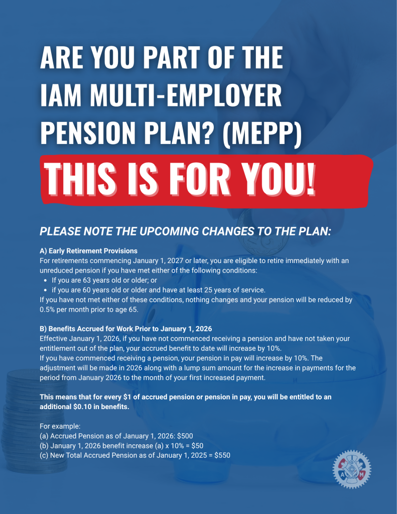 Changes to the IAM Multi-Employer Pension Plan (MEPP) IAM Union 27 March, 2026 Click here to download the flyer. More information in the flyer below – Click here to download.