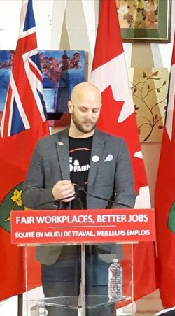 When the Barrie and District Labour Council was invited to an event where Ontario’s Labour Minister Kevin Flynn would be making announcements regarding how Ontario Bill 148 – The Fair Workplaces/Better Jobs Act 2017 – would improve the lives of working families in Barrie, the council asked Dan Janssen to speak about the $15 and Fairness Campaign. The government passed the Bill into law on November 22nd but not without a concerted push from the $15 and Fairness campaign.